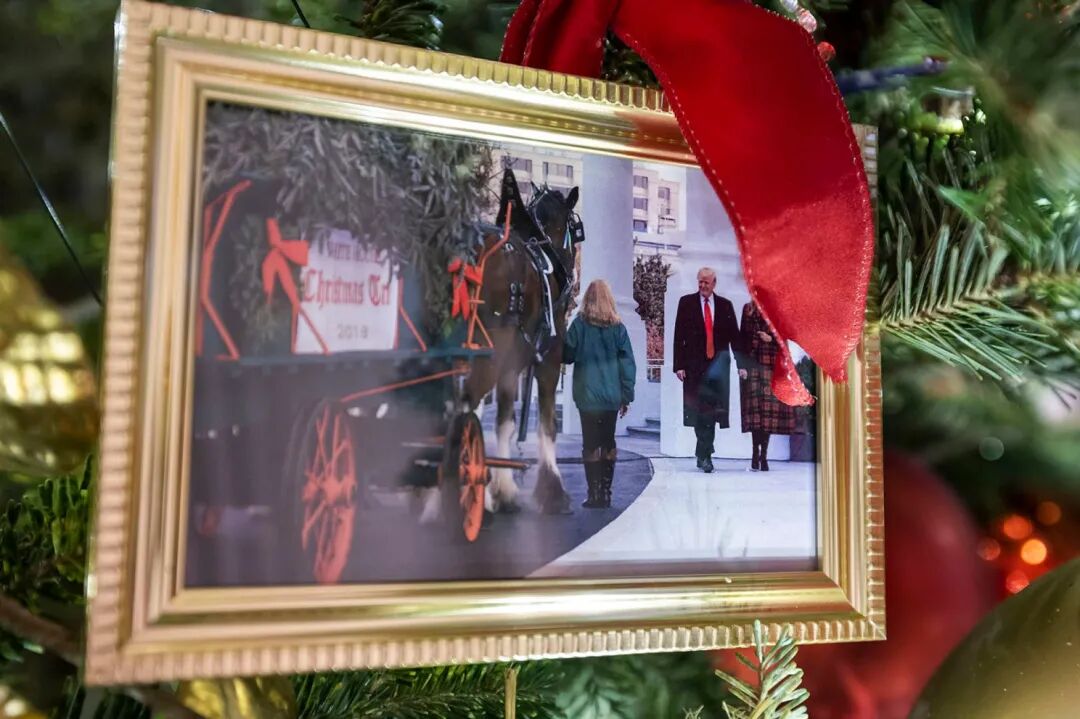 国前总统唐纳德·特朗普(Donald Trump )和第一夫人梅拉尼娅·特朗普(Melania Trump)的照片夹在白宫国宴厅的圣诞树上。