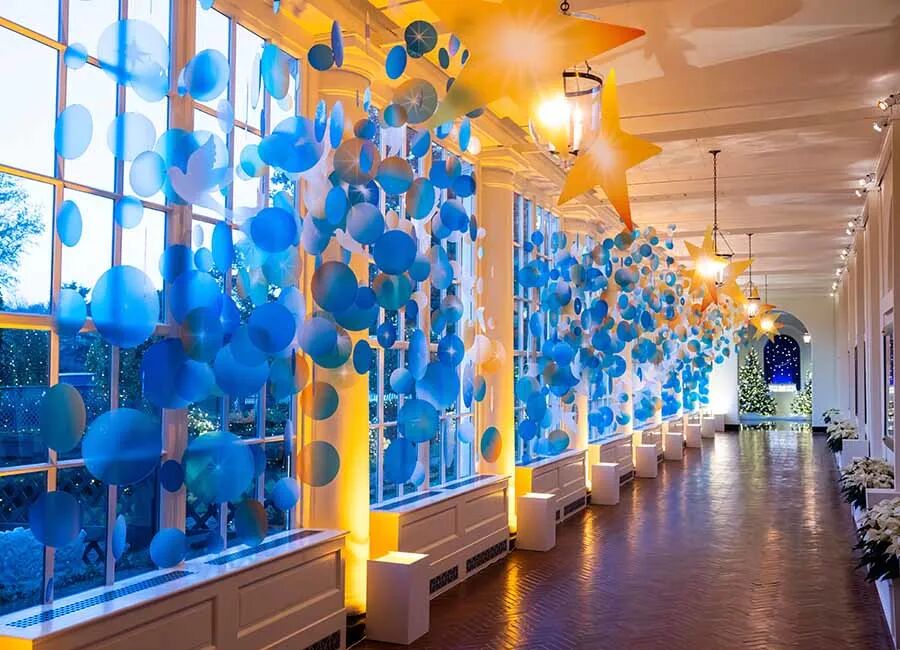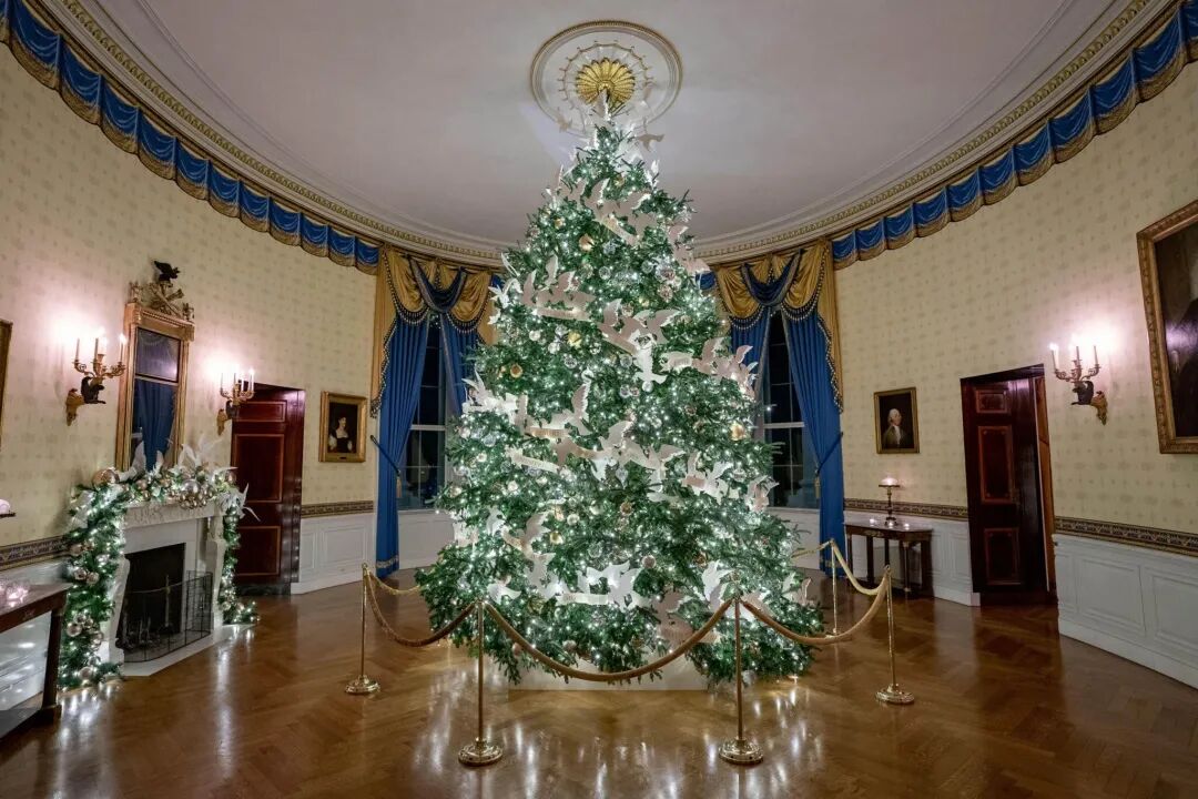蓝色房间,以白宫官方圣诞树为特色,庆祝和平与团结的礼物。和平鸽从树上飞落下来,它们举着一面闪闪发光的旗帜,上面印着美国每个州和领土的名字,提醒我们团结和国家和谐的重要性。
