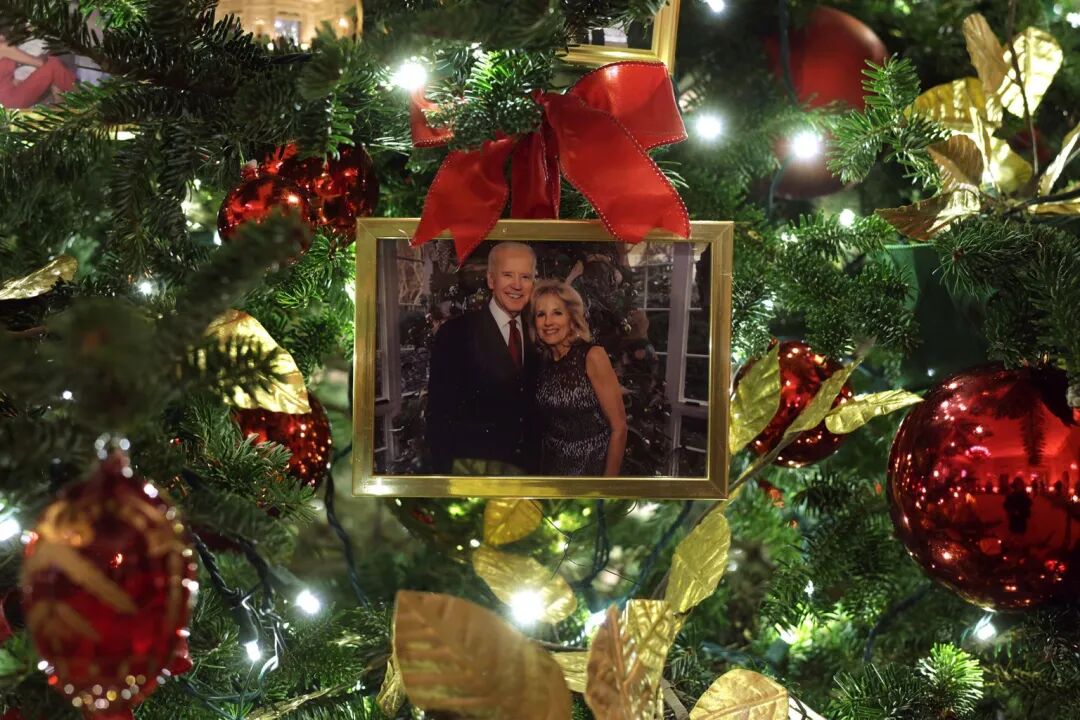 (拜登和第一夫人的照片也是圣诞树的装饰品之一。)