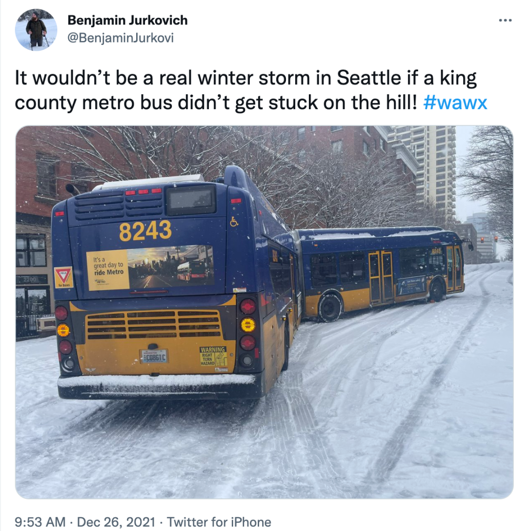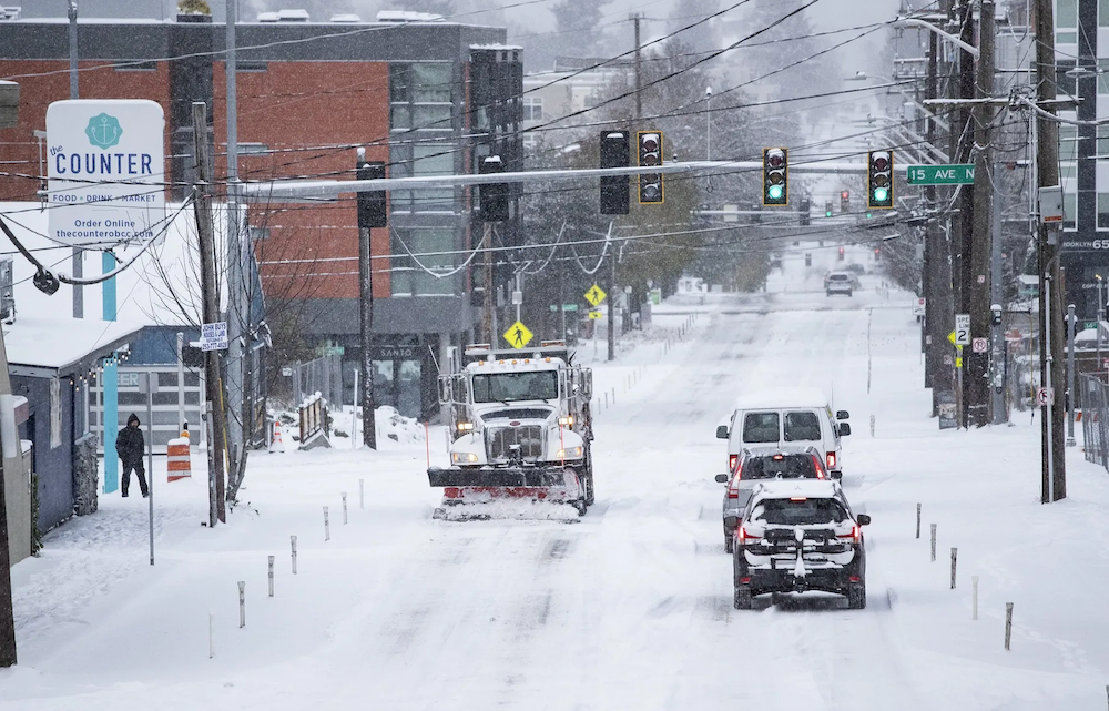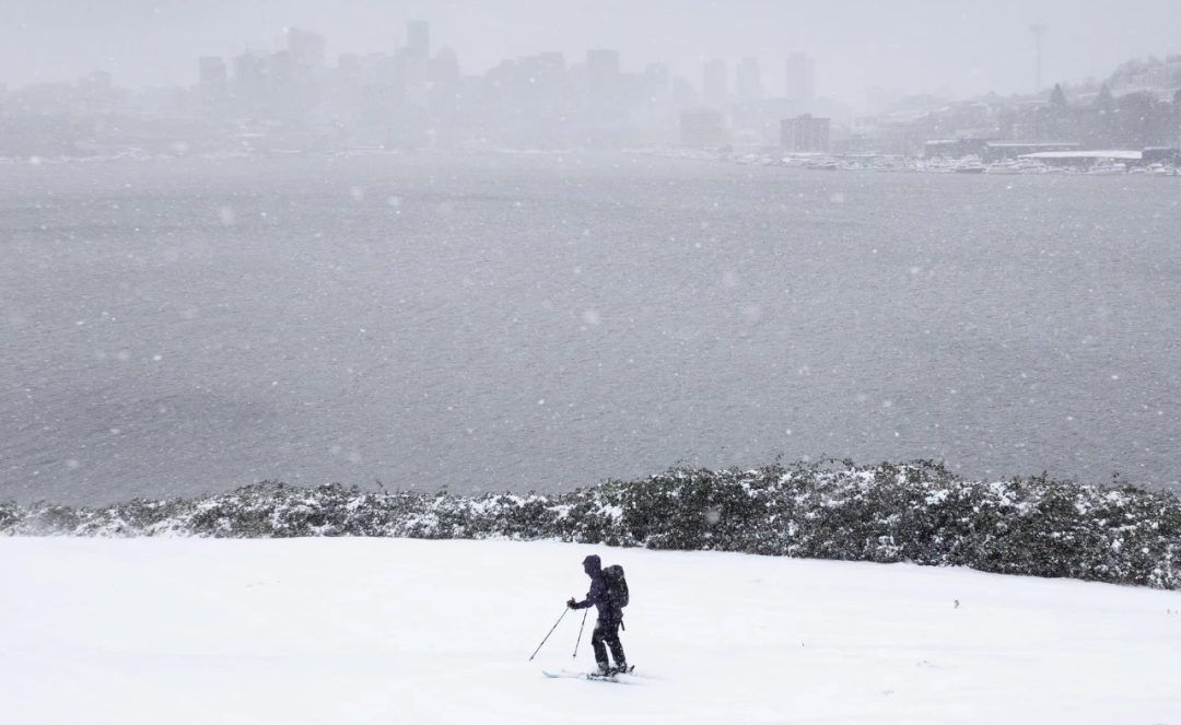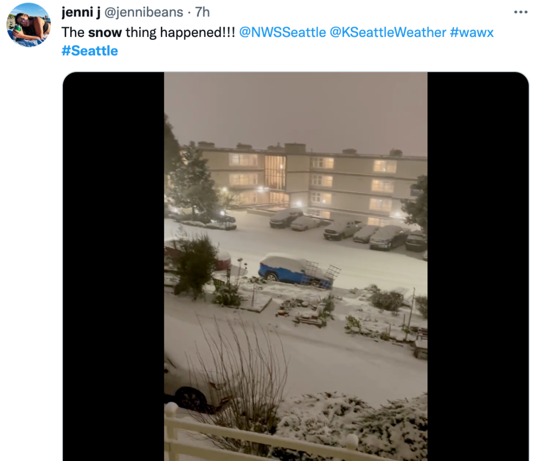 一个移动到华盛顿州西部的天气系统带来了冷空气,也带来了较不寻常的降雪。西雅图人醒来时发现一夜之间,天地变白了,许多人在推特上分享大量雪景的照片。