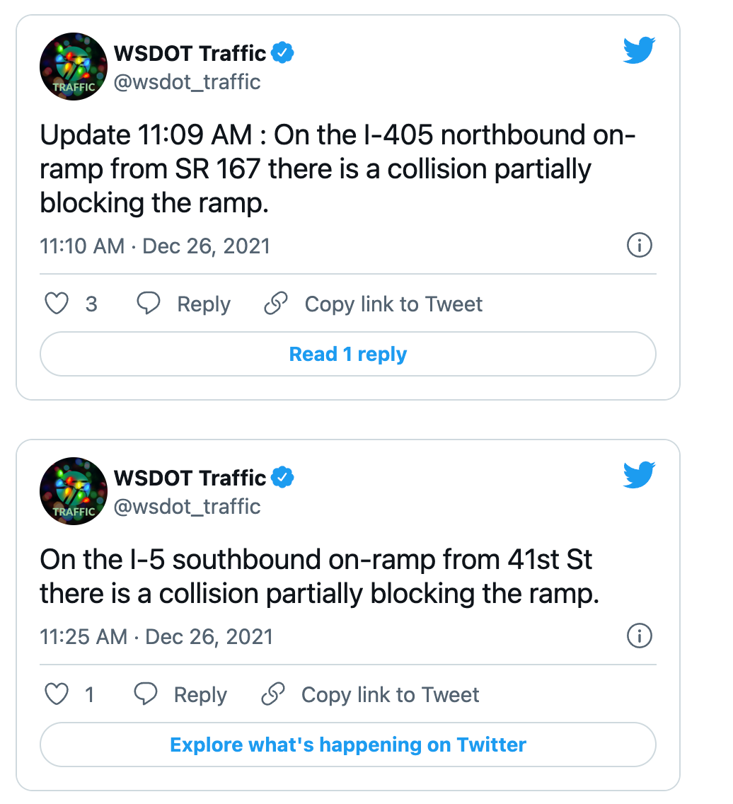 到周日上午8点,天气对西雅图的交通造成了影响。多起碰撞事故封锁了41街的I-5南行匝道,华盛顿州交通局在社交媒体上发布了在金县和斯诺霍米什县交界处的雪地道路上一辆打滑的车辆的录像和多起事故报道。