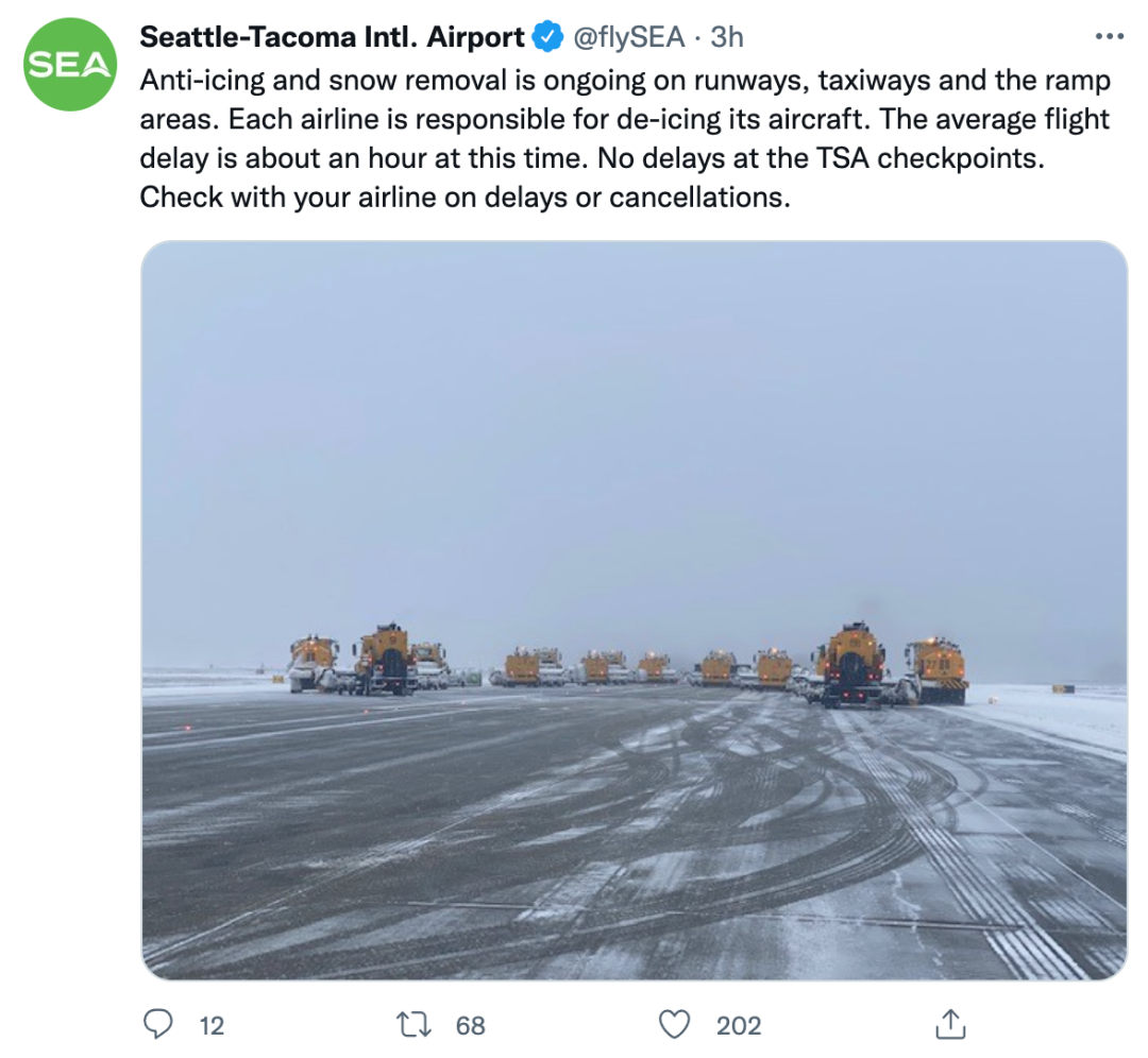 西雅图港发言人凯特-哈德森(Kate Hudson)说,周日上午,从Sea Tac机场起飞的航班平均延误一个多小时。根据航班跟踪网站FlightAware的数据,到上午12点,有25个航班被取消。