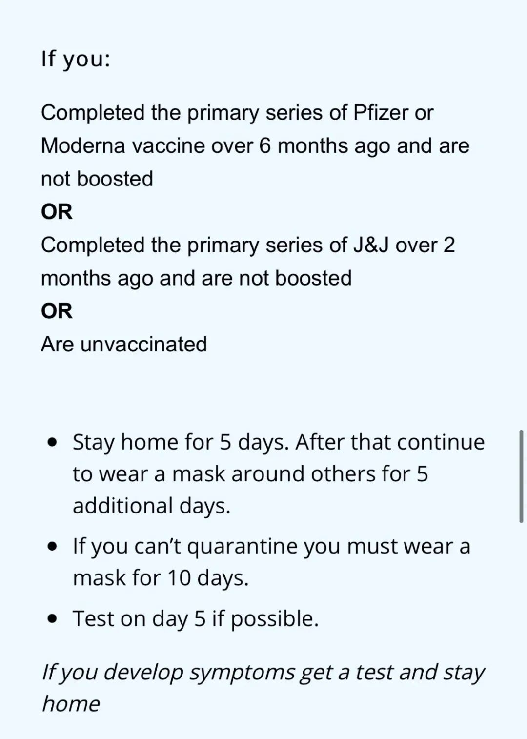 二、如果接触了新冠检测呈阳性者如果已经接种加强剂,或全面接种辉瑞或Moderna疫苗不超过6个月,或全面接种强生疫苗不超过2个月:- 需要在有其他人在的场合戴口罩10天。