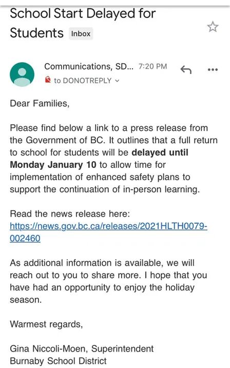 本那比学校局已发送学校迟开学的通知电邮。(受访者提供)