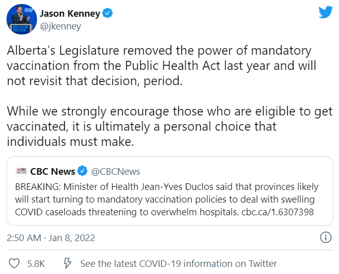 阿省省长Jason Kenney在社交媒体上表示,该省政府不会强制接种疫苗。