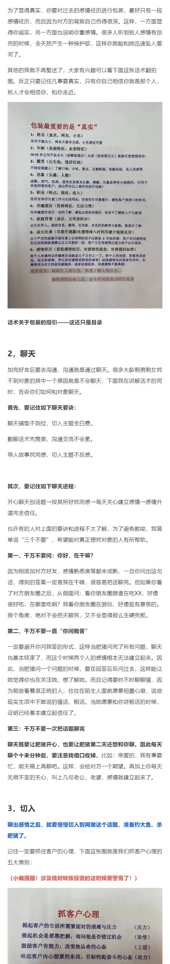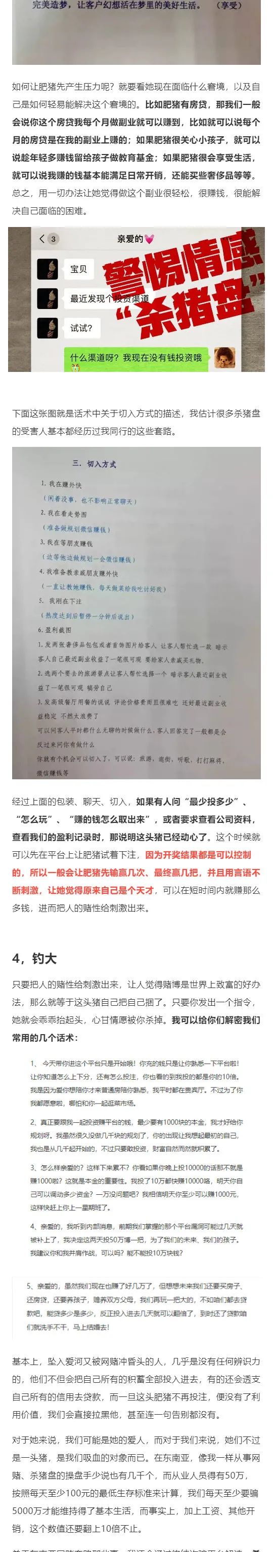 据那些落网的骗子描述,他们会接受统一的培训,甚至细节到个人星座、居住地点有哪些可口的小吃,曾被爆光的部分「杀猪盘」剧本,就多达80多页,包括包装、聊天、不同人群内心分析等内容。 剧本也会随着时代背景更新,例如近期被骗的都是以为将钱投入了数字货币市场,而过去一年数字货币确实受到不少投资者的青睐。