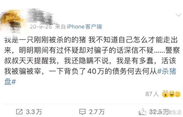 有网友分享了自己闺蜜惨遭“杀猪盘”,10万美金全部打水漂的经历。一个研究生高材生、平日里还是个博主,结果被骗走50万人民币,搞到最后重度抑郁想自杀的地步!