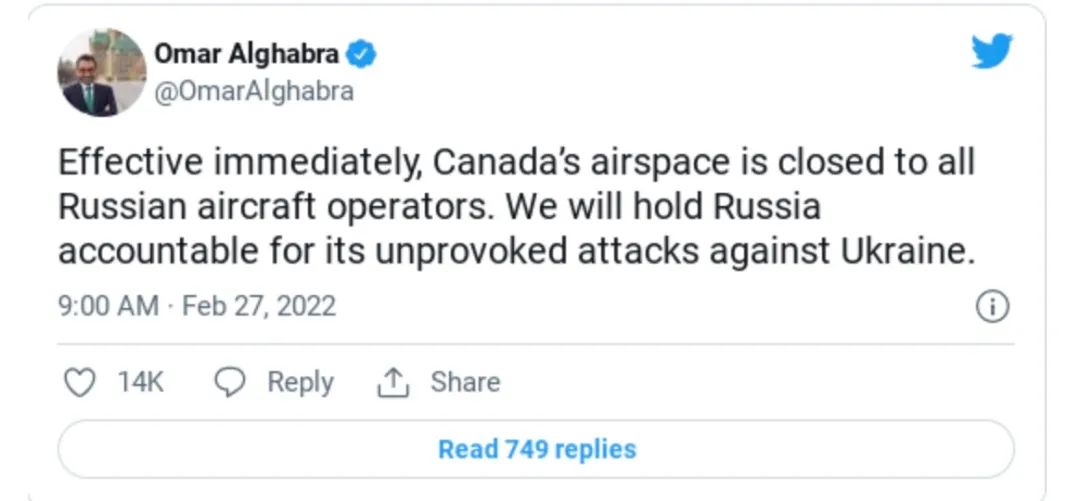 突发!加拿大宣布对俄关闭领空!返华北极航线将受到巨大影响!2万乌克兰难民专机赴加!