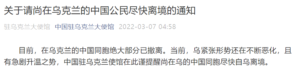据中国驻乌克兰大使馆官方微信公众号消息,目前,在乌克兰的中国同胞绝大部分已撤离。当前,乌紧张形势还在不断恶化,且有急剧升温之势,中国驻乌克兰使馆在此谨提醒尚在乌的中国同胞尽快自乌离境。