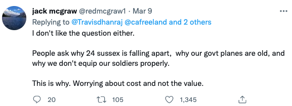 “我认为大多数加拿大人根本不觉得特鲁多有浪费纳税人钱的感觉,我认为大多数加拿大人非常高兴和自豪地看到专注于尽我们所能帮助乌克兰...并继续在全球关注焦点的事情上发光。♥️