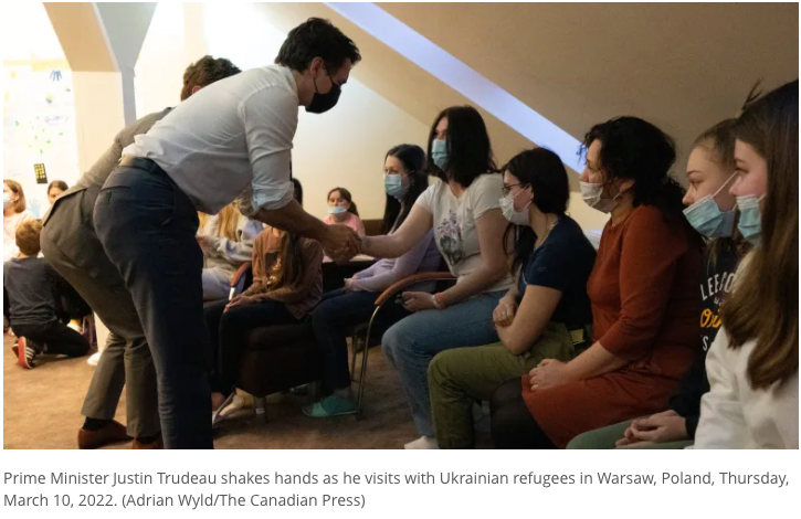 周四(3月10日)黄昏时分,特鲁多在华沙市中心一家旅馆与十几名难民呆了大约半小时。