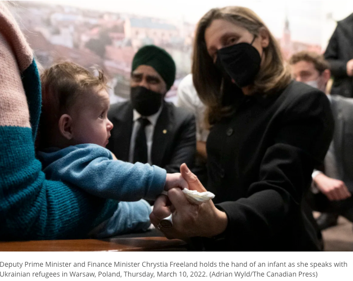 外交部长乔莉说,加拿大正在与整个东欧的联合国难民事务高级专员密切合作,在就安全通道协议进行谈判后,想方设法将难民接到加拿大。