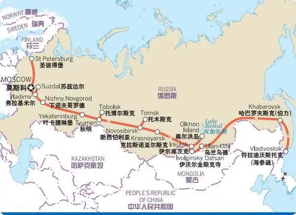 大西伯利亚铁路 从莫斯科到海参崴(原中国领土) 乘坐火车大约需要152小时27分钟