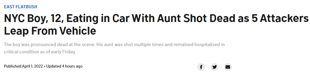 根据nbc报道,这名男孩的身份尚未公布,警方表示,他并不是这起发生在街和东弗拉特布什(East Flatbush)东56街和林登大道(Linden Boulevard)附近的枪击事件的目标。他当时坐在副驾驶座位上,头部和胸部被击中。