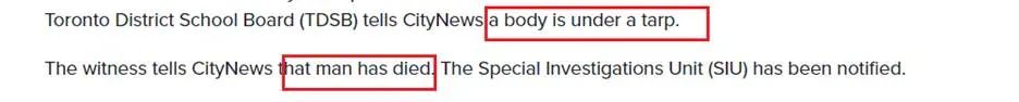 目击者 Mike Grieve则表示,警方开枪打死了一名武装人员,“那个已经死了。已通知特别调查组SIU。”