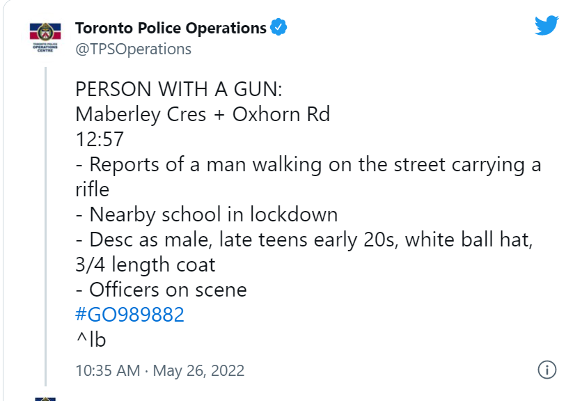 东部时间5月26日(周四)中午1点多,多伦多警方接报,有人携带来福枪,在士嘉堡Port Union社区街道上活动。