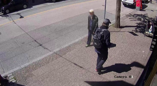 2022年5月20日(周五),在温哥华唐人街的一个公共汽车站旁,一名87岁男子被随机喷熊喷雾。 (图自:温哥华警察局)