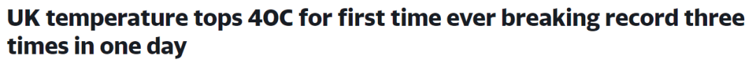 据世界气象组织(WMO)监测的数据,近日英国气温首次突破40摄氏度(104华氏度),打破有史以来的最高温度记录。气象局表示,40度以上高温对于英国而言是300年难遇的极端情况。
