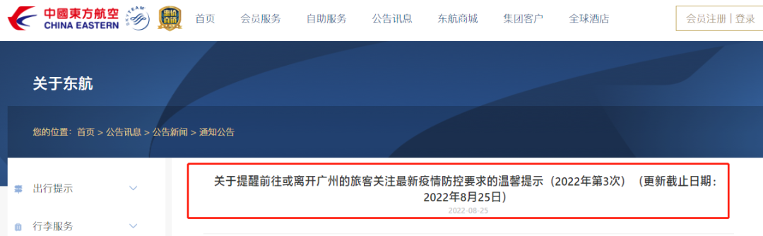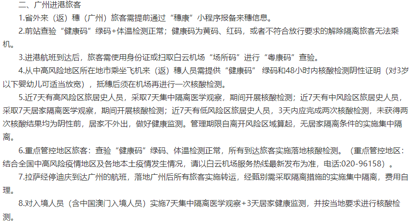 例如在东航的官网上,最新更新的防疫要求也指出:广州进港旅客中,对入境人员(含中国澳门入境人员)实施7天集中隔离医学观察+3天居家健康监测,并按当地要求进行核酸检测。