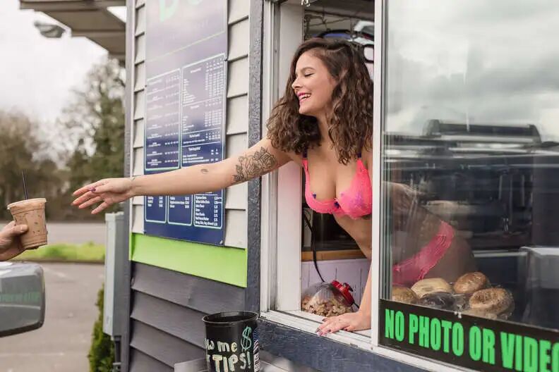 为了在众多咖啡店中脱颖而出,吸引更多顾客,上世纪80年代,比基尼咖啡店(bikini baristas)应运而生。一些专为Drive-through顾客提供咖啡和小吃的街头小店为了生存,依靠穿着比基尼、内衣、丝袜和高跟鞋等服装的性感咖啡师招揽生意,它们通常有着令人兴奋的名字,像是“Cowgirls Espresso”、“Smokin' Hot Espresso”...
